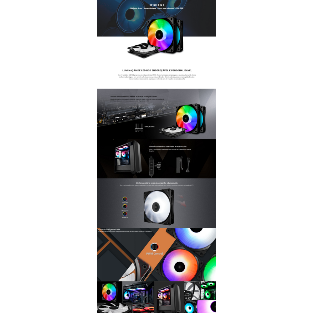 O conjunto de ventoinhas 3 em 1 modelo DeepCool CF 120 PWM inclui 36 LED RGB endereçáveis com 12 LEDs em cada ventoinha de 120mm para efeitos de iluminação brilhantes e uma boa refrigeração.